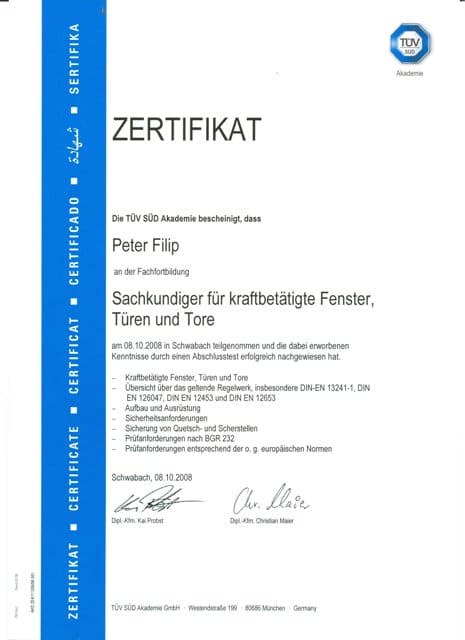 Sachkundiger für kraftbetätigte Fenster, Türen und Tore